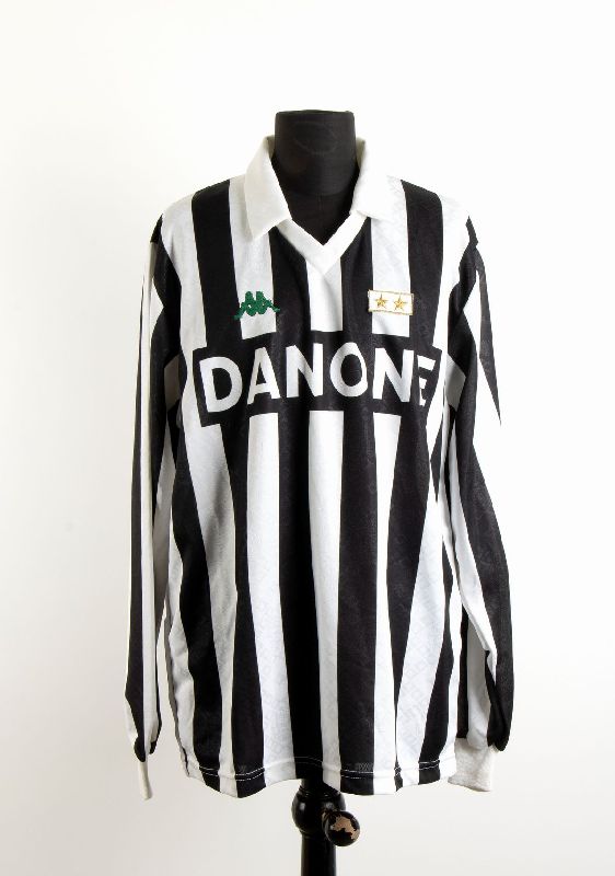 Maglia di calcio della Juventus , anni 1992-93, numero 11 per Andreas Moller. Maglia maniche lunghe, in jersey, scollo a V, sponsor DANONE stampato al petto, patch con due stelle cucita a sinistra, marchio Robe di Kappa ricamato in verde a destra, numero 11 stampato sul dorso. In perfette condizioni, con targhette originali. La maglia proviene dalla collezione personale dal "mister" Rino Marchesi allenatore della Juventus nelle stagioni 1986-88