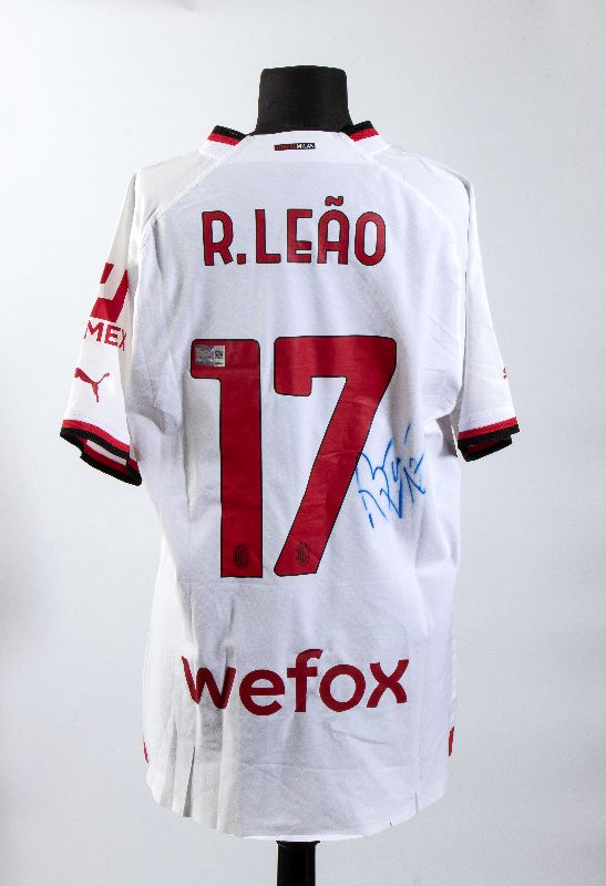 Sul retro: numero 17, nome R. LEAO e sponsor WEFOX in basso, in sublimatico. Autografo originale di Rafa Leao apposto ad inchiostro blu accanto alla cifra 7. Adesivo cromatico con QR CODE dell'autentica di MEMORABILIA STARS applicato sulla cifra 1