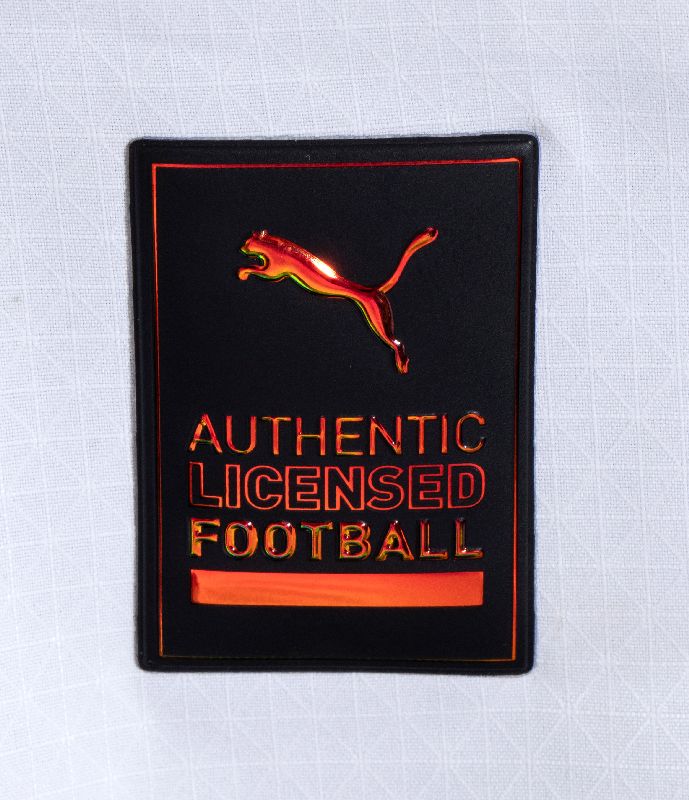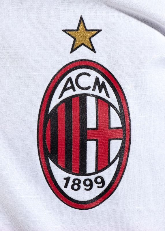 Sul fronte: sponsor EMIRATES FLY BETTER, logo PUMA, logo ACM 1899 con stella dorata in sublimatico, scudetto tricolore al centro, in sublimatico con lavorazione a dettagli ondulati in rilievo.