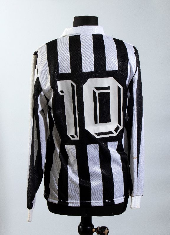 Contati 16 autografi dei calciatori della Juventus, originali a pennarello blu, si riconoscono Julio Ceasar, Roberto Baggio, Totò Schillaci, Thomas Hassler, Eugenio Corini, Daniele Fortunato, Nicolò Napoli, Giancarlo Marocchi, Stefano Tacconi, Luigi De Agostini, Gianluca Luppi, Pierluigi Casiraghi. Galia. In perfette condizioni, lievi macchie sulla manica destra.