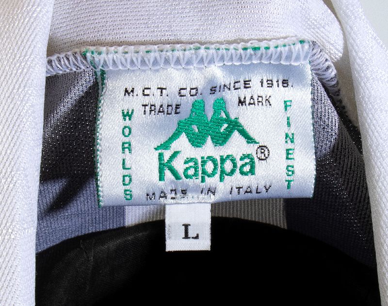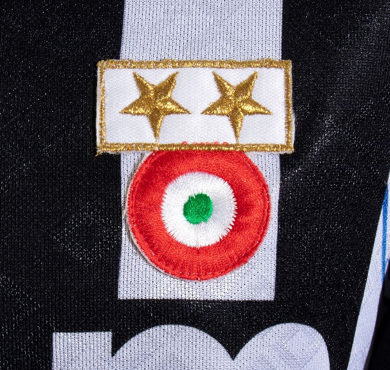 Sul fronte: sponsor UPIM, logo Kappa ricamato in verde, coccarda tricolore e fascetta con due stelle cucite.