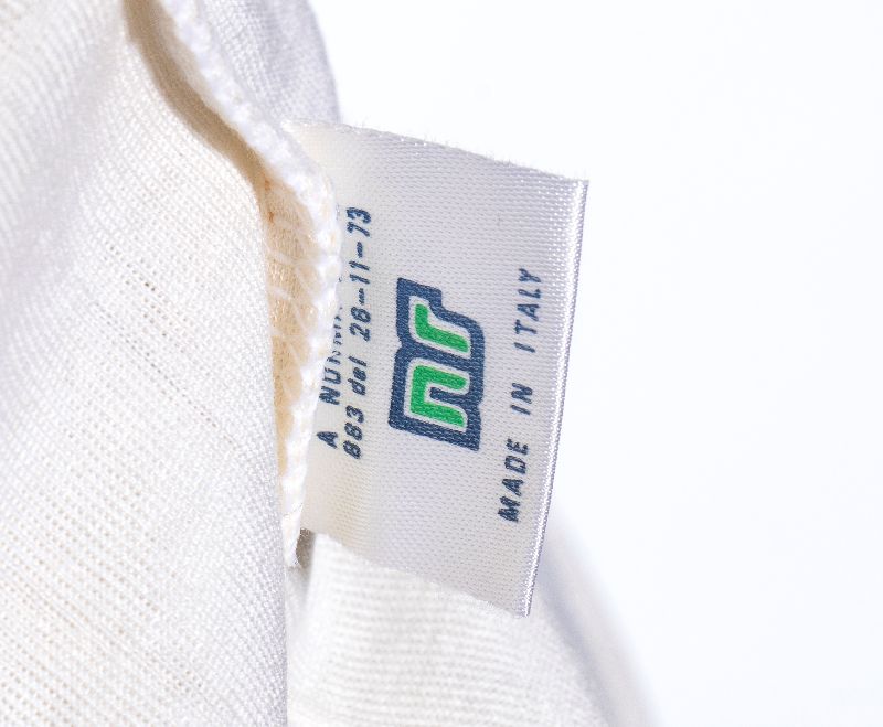 Maglia COSMOS da gara, bianca, a maniche corte, ENNEERRE acrilico. Colletto blu profilato giallo. Etichetta interna "A norma legge 883 del 26-11-73 NR Made in Italy"