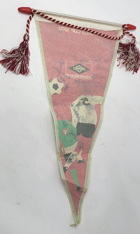 Gagliardetto originale per i mondiali di calcio di Mexico 70 con autografi dei calciatori italiani. Immagine di calciatori in azione e la scritta WORLD CUP 1970 MEXICO con lo sponsor UMBRO INTERNATIONAL. Gli autografi sono originali, scritti di pugno dai calciatori della nazionale italiana. Si riconoscono Boninsegna, De Sisti, Furino, Bertini, Gigi Riva, l'allenatore Valcareggi. Alcune firme sbiadite. Completo di asta.