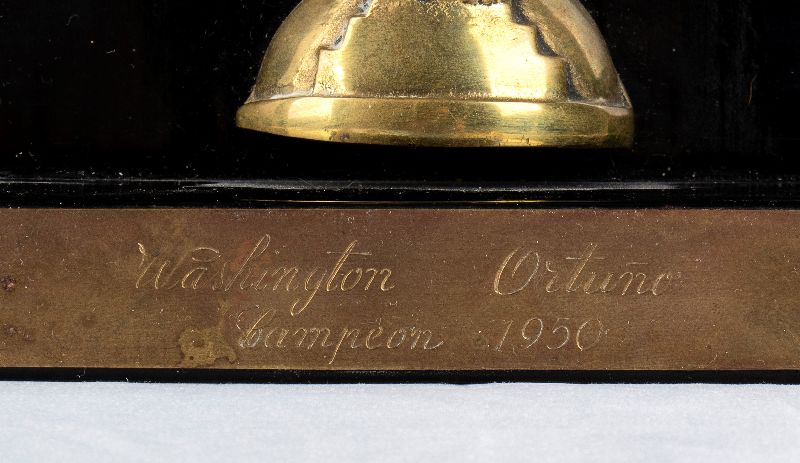 Questo è appartenuto a Washington Ortuño (Montevideo, 13 maggio 1928 – 15 settembre 1973) calciatore dell' Uruguay , come riportato sulla targhetta applicata alla base. Misura come la coppa originale, riprodotta a mezzo tondo, ed è estremamente rara, considerando che dal 1970 la Coppa Rimet non è più assegnata ed è stata sostituita dall'attuale trofeo della F.I.F.A.