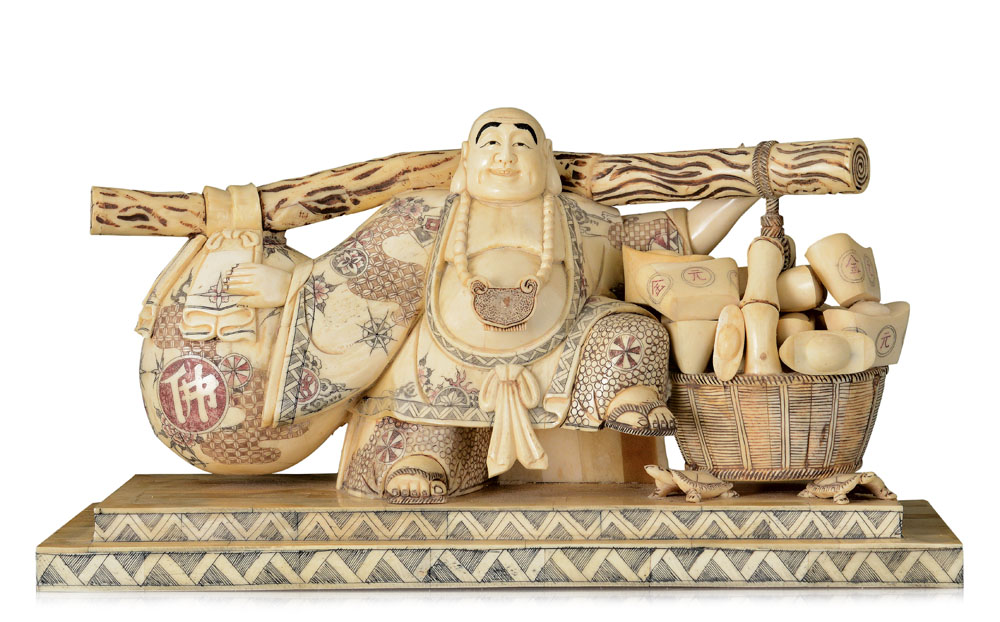 AVORIO FIGURA DI CONTADINO CON CESTE IN OSSO, CINA, XX SECOLO.Dim. cm 46x17,5...