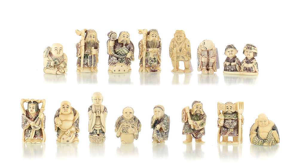 LOTTO DI QUINDICI NETSUKE IN AVORIO, XX SECOLO, raffiguranti personaggi con decori policromi.