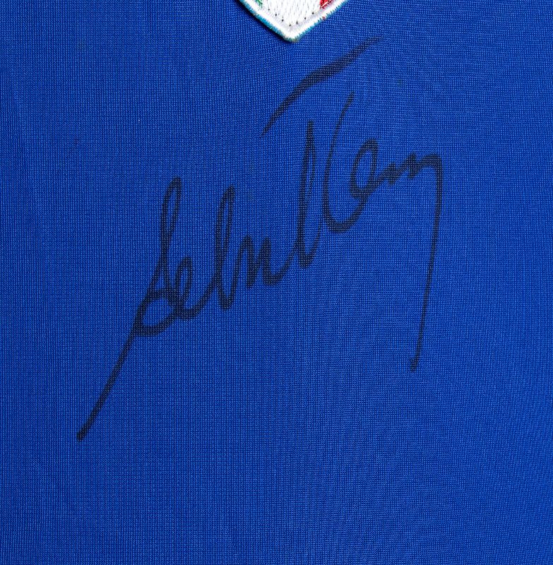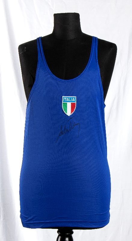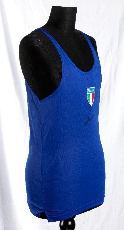 Canottiera azzurra, atletica, di Alberto Cova. Sul fronte scudetto tricolore ITALIA ricamato ed applicato, autografo scritto di pugno da Alberto Cova, a pennarello nero indelebile.