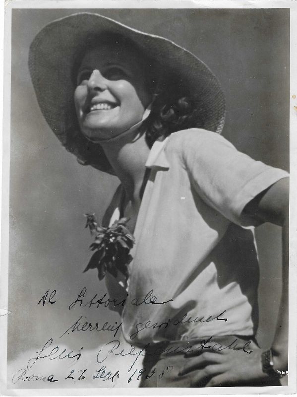 Fotografia in b/n su carta lucida, bel ritratto di Leni Riefensthal (Helene Bertha Amalie Riefenstahl - Berlino, 22 agosto 1902 – Pöcking, 8 settembre 2003) la più celebre regista tedesca degli anni Trenta, che nel 1938 con il suo Olympia, lungo documentario sulle Olimpiadi di Berlino del 1936, vinse la Coppa Mussolini alla Mostra del cinema di Venezia.