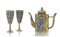 UNA TEIERA IN ARGENTO DORATO E SMALTI, CINA, E DUE PICCOLI CALICI IN ARGENTO DORATO E NIELLO, INIZIO XX SECOLO, teiera quadrilobata con decoro a rami fioriti e volatili a smalti policromi, calici con decori floreali.