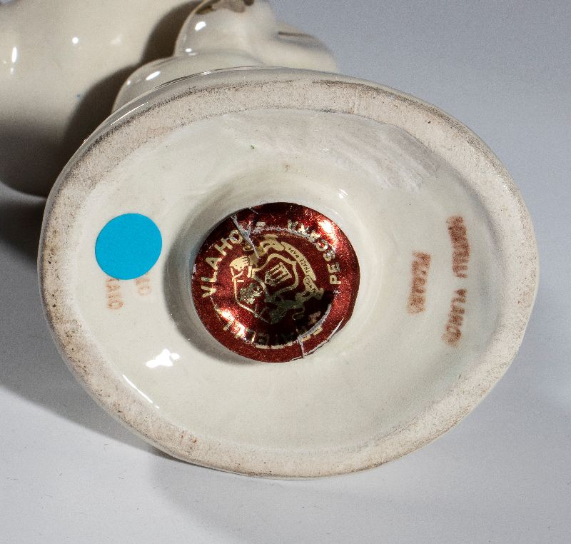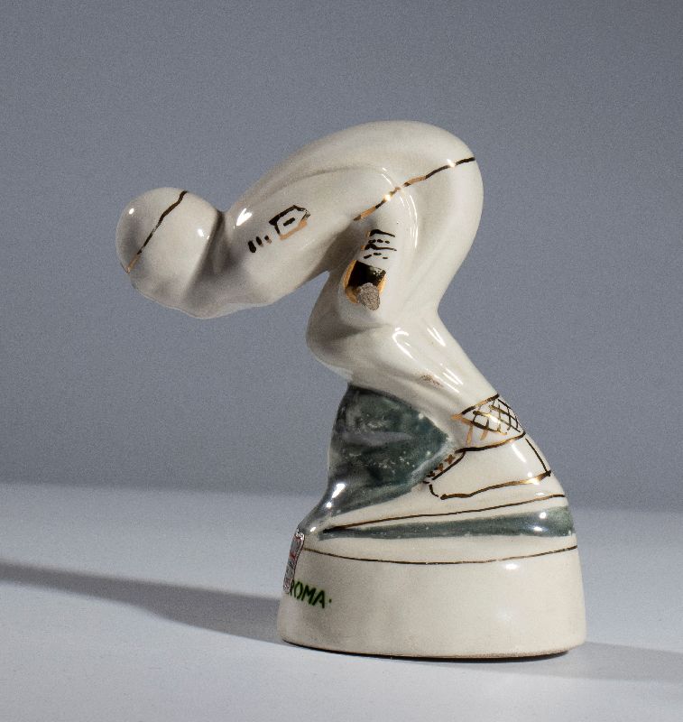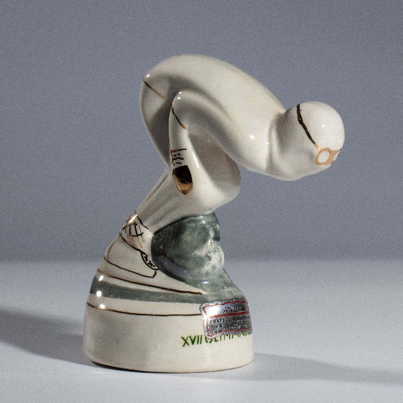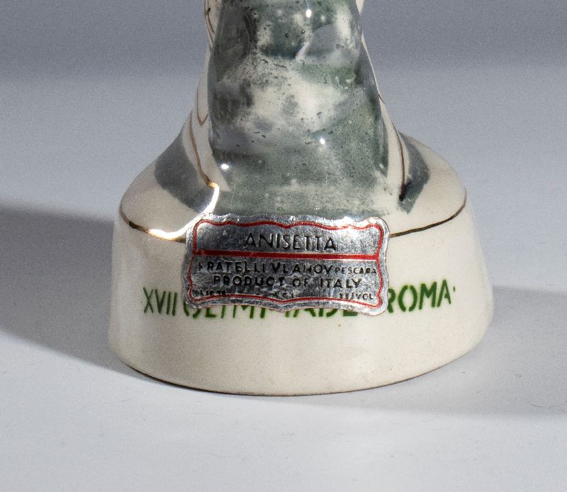 Gadget promozionale della XVII OLIMPIADE di Roma del 1960, mignon di liquore, scultura in ceramica policroma raffigurante atleta olimpico sciatore. Marcata FRATELLI VLAHOV - PESCARA - MODELLO DEPOSITATO. In perfette condizioni, misura circa cm. 13 x cm.15
