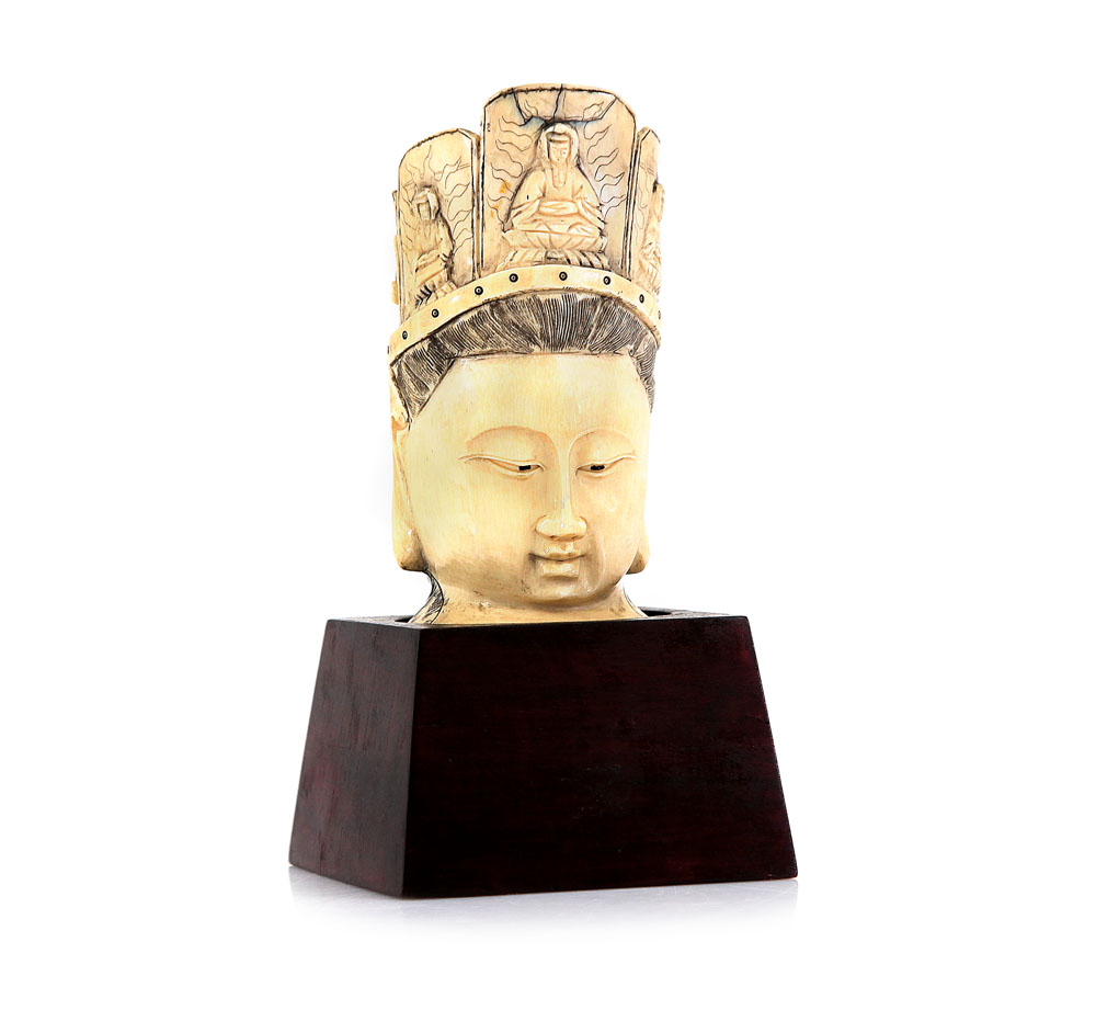 SCULTURA IN AVORIO, CINA, XX SECOLO, raffigurante testa di divinità su base a plinto in legno.