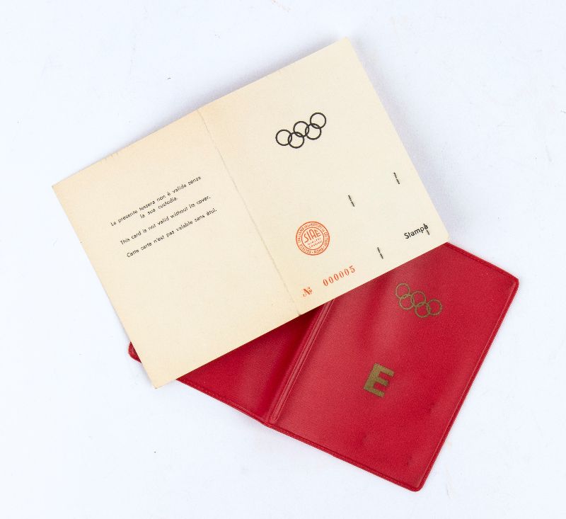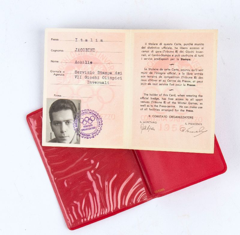 - tessera personale per il membro del Servizio Stampa dei giochi di Cortina, rilasciato dal Comitato Organizzatore, completo di custodia in pelle con impressi in caratteri similoro il logo delle Olimpiadi e la lettera "E"