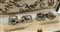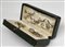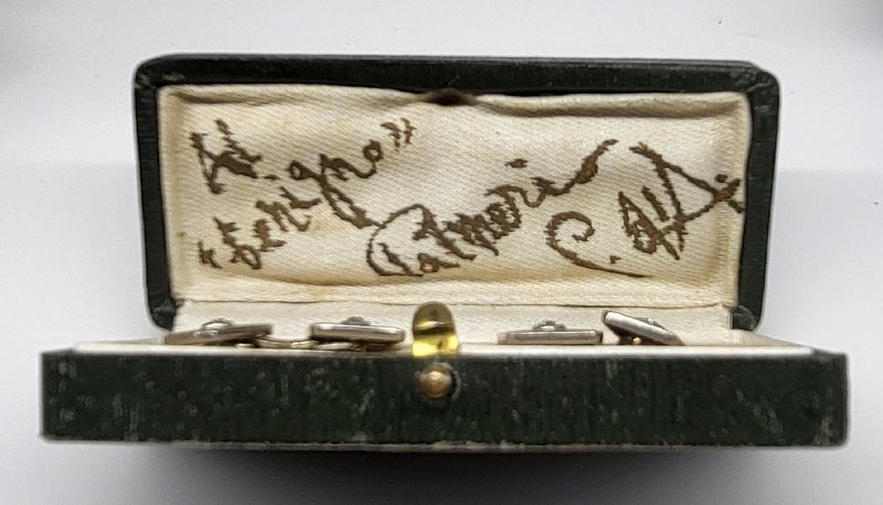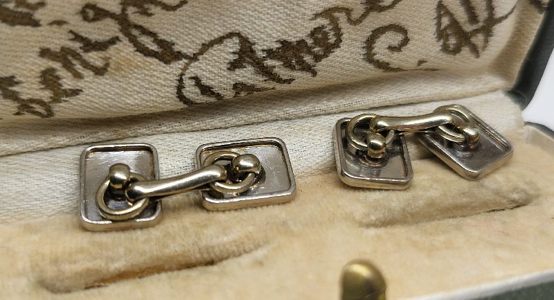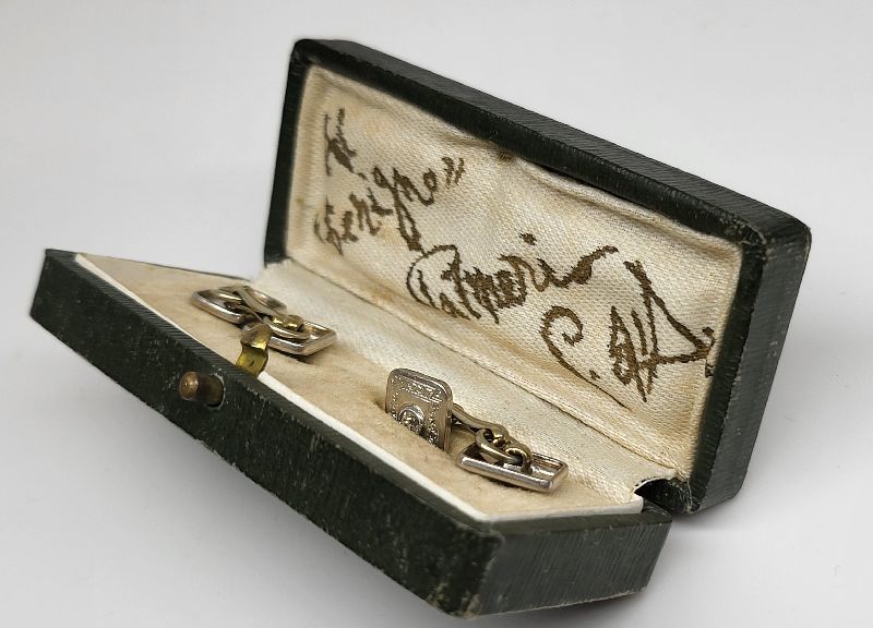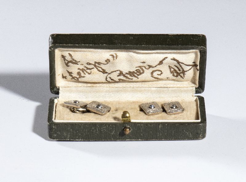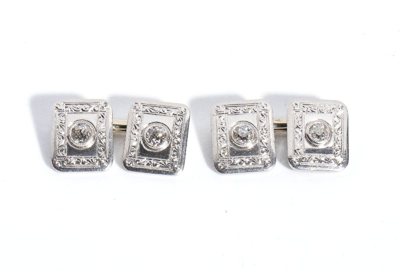 Coppia di gemelli da polso, in metallo prezioso con diamante centrale (taglio antico) su ognuna delle quattro piastrine (per totale punti 40), contenuti in scatolina originale coeva, in similpelle verde ed interno in vellutino e stoffa.