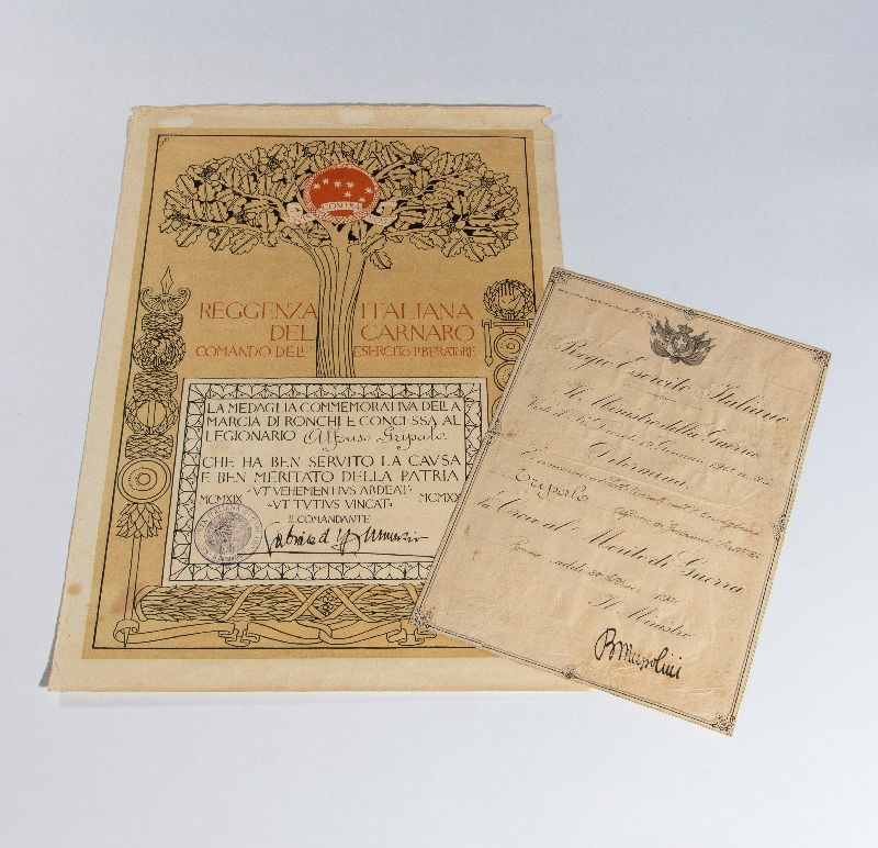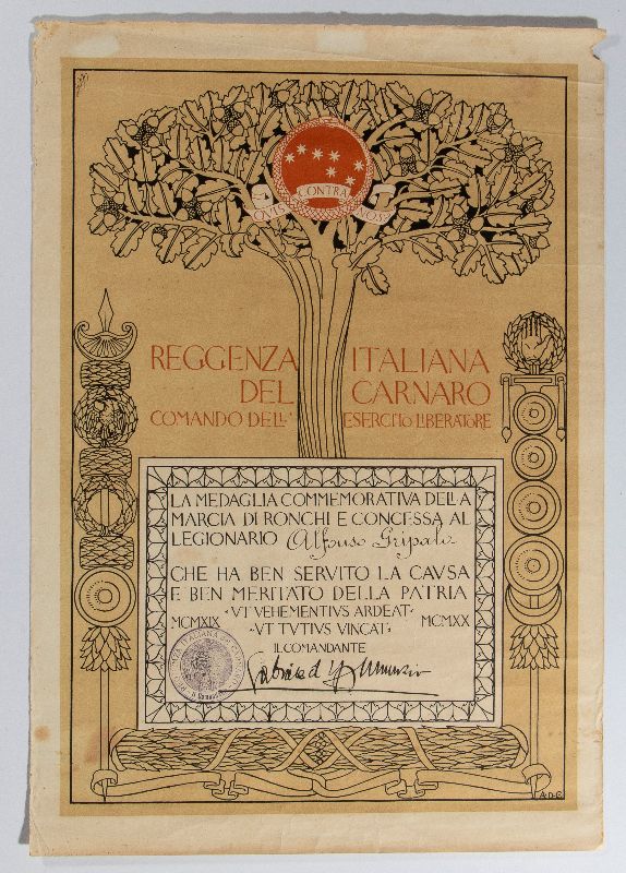 D'Annunzio, Gabriele - Attestato Marcia di Ronchi 1920 cm.47x33