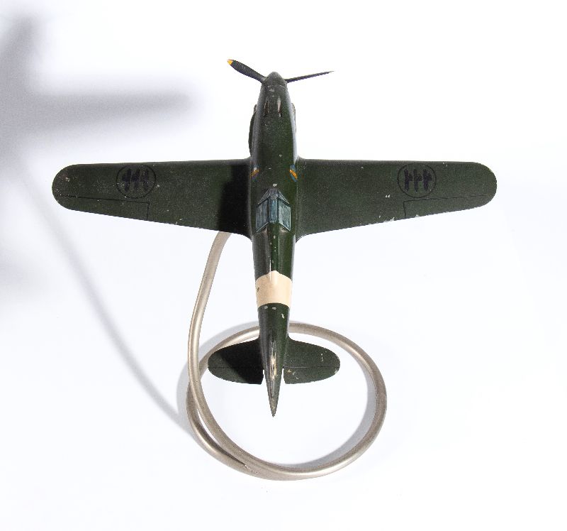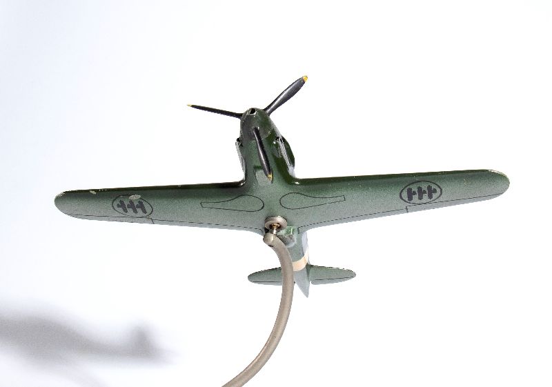 Modello in fusione di alluminio autarchica del G202 caccia della AER MACCHI. Elica tripale girevole, livrea originale periodo bellico, Regno d'Italia con emblemi fascisti sulla fusoliera. Piedistallo a spirale in metallo, originale, con snodo alla pancia dell'aereo per regolarne il posizionamento.