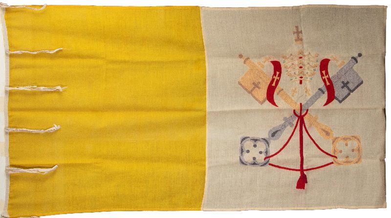 Metà '900, bandiera dello Stato del Vaticano, in cotone grezzo, due campi giallo e bianco cuciti tra loro. Stemma araldico della Città del Vaticano ricamato su campo bianco, «Chiavi decussate sormontate dal triregno»