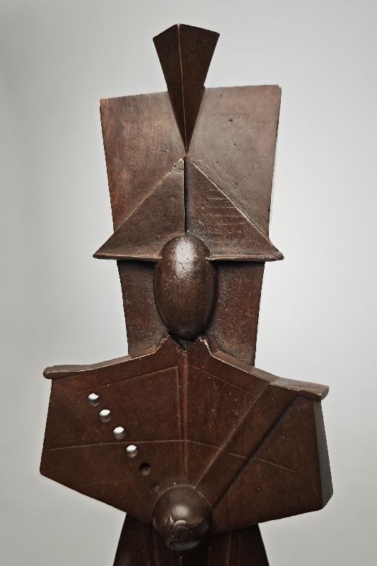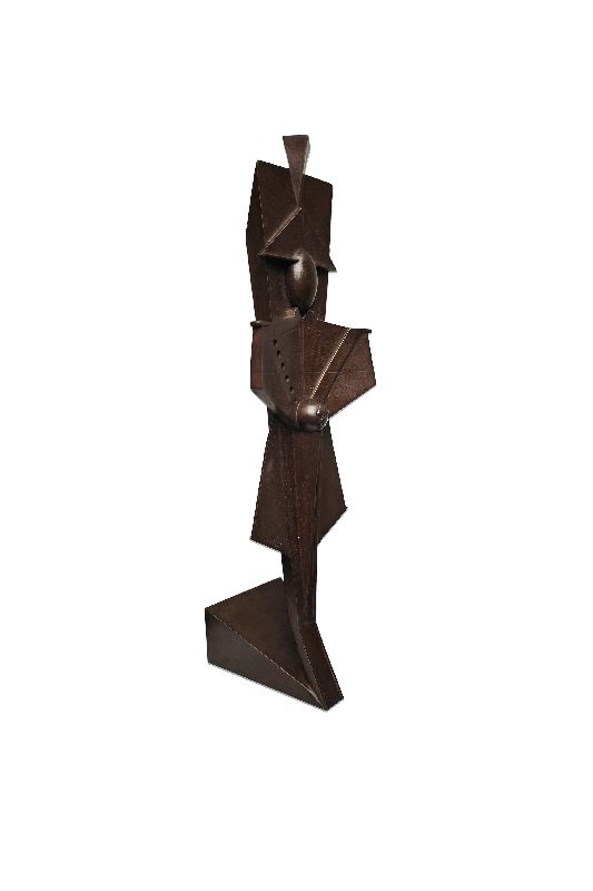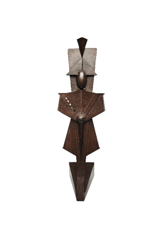 La spazialità bidimensionale dell’opera e le sagomature realizzate con linee leggere e sicure nel tratto, inducono l’osservatore a percepire una plasticità tridimensionale volutamente illusoria della scultura, una poliedricità di un’Arma da sempre impegnata su molteplici fronti. Solitaria e ordinata, la figura è ancorata a un basamento a indicare la solidità persistente delle radici di una Istituzione nei “Secoli Fedele”, votata a essere custode della legalità. Sulla sciabola, impugnata nella cosiddetta posizione del “riposo” ma sempre pronta a un rapido impiego, si trova uno dei segni di riconoscibilità dell’Arma dei Carabinieri: la granata con fiamma. Posizionata appositamente al centro dell’opera scultorea, essa è interpretata dall’Autore quale fonte di luce che possa illuminare il sentiero del Maresciallo. Il “viso senza volto” vuole esaltare le differenze individuali, evocare la responsabilità sociale delle donne e degli uomini dell’Arma dei Carabinieri chiamati a custodire il dono prezioso della libertà.