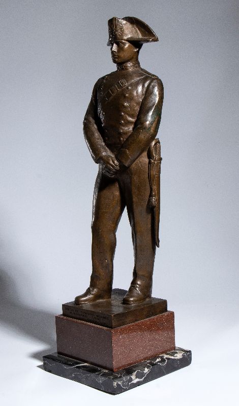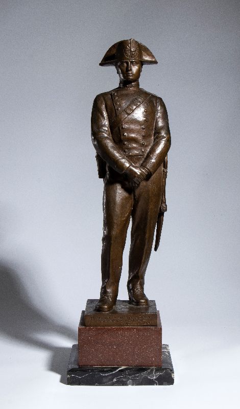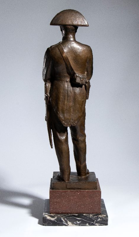 Scultura in bronzo a figura intera di Carabiniere Reale in uniforme di servizio, con cappello, marsina, daga.
