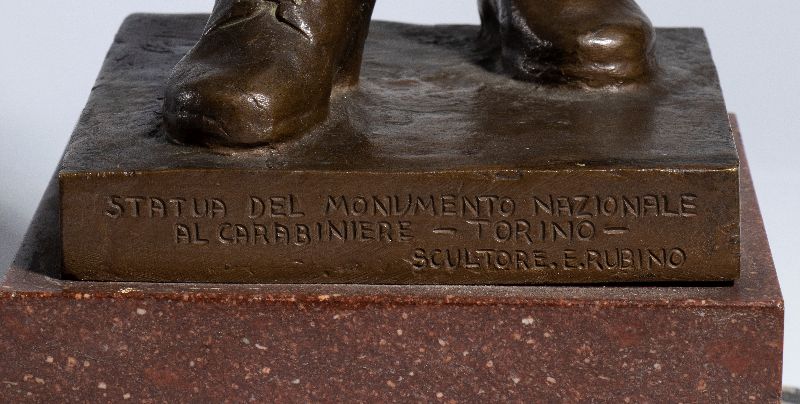 Firmata Edoardo Rubino (scultore - Torino, 8 dicembre 1871 – Torino, 16 gennaio 1954), sulla base in bronzo reca l'incisione "STATUA DEL MONUMENTO NAZIONALE AL CARABINIERE, TORINO - SCULTORE E.RUBINO - FOND.ART.LAGANA' NAPOLI"