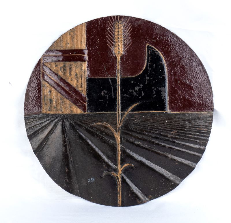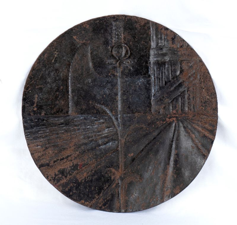 Placca circolare in metallo lavorata a rilievo, celebrativa delle opere di bonifica e della Battaglia del Grano del Ventennio fascista. Dipinta in colori rosso bordeaux, marrone, nero e giallo oro. Originale degli anni 30 del XX secolo, molto interessante, con gancio per esposizione a parete, misura circa cm.34 di diametro