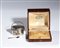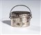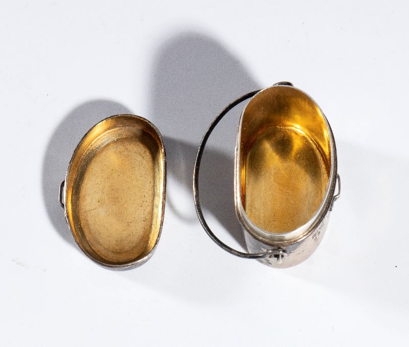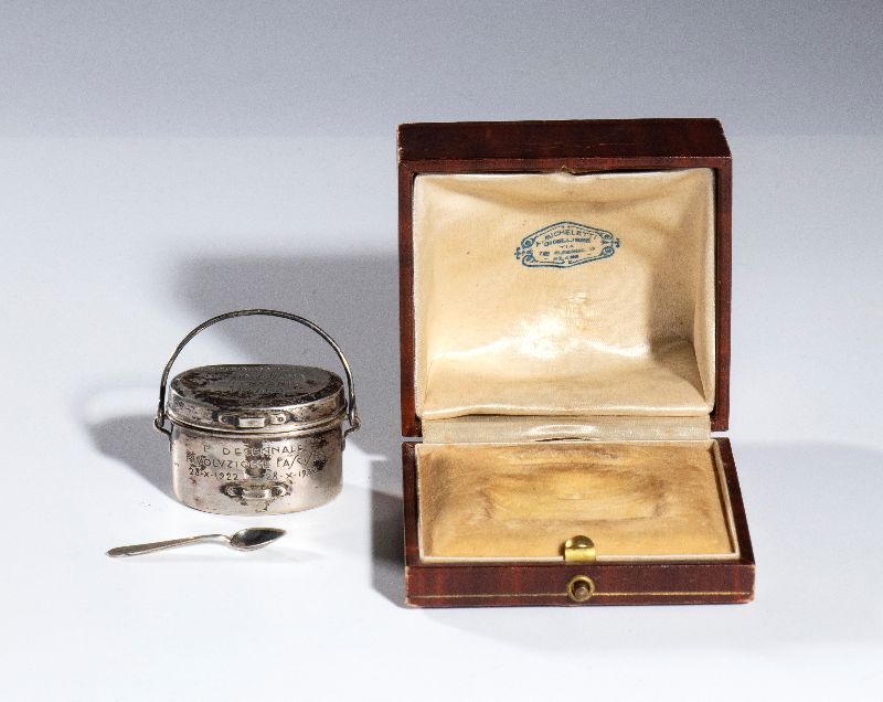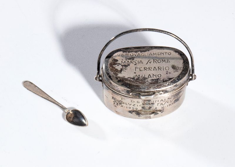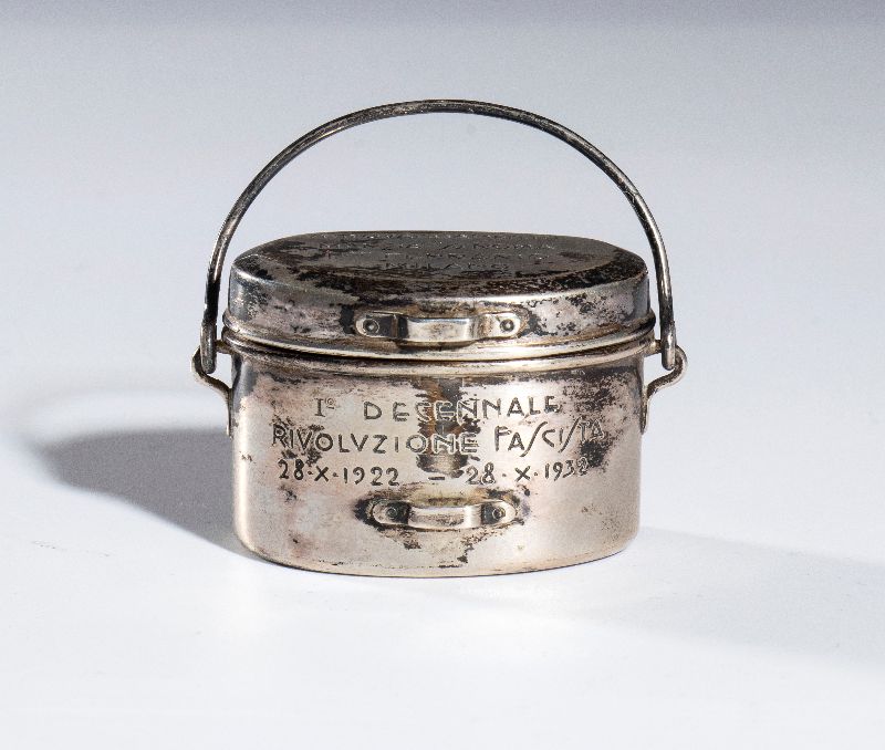 Gadget commemorativo della Marcia su Roma, realizzato a forma di una gavetta con coperchio e cucchiaio in argento. La piccola gavetta riporta inciso sul corpo "PRIMO DECENNALE della RIVOLUZIONE FASCISTA 28 X 1922 - 28 X 1932" sul coperchietto "VETTOVAGLIAMENTO MARCIA SU ROMA" . Completa del suo cofanetto originale timbrato all'interno "A.MICHELETTI - GIOIELLIERE - MILANO"