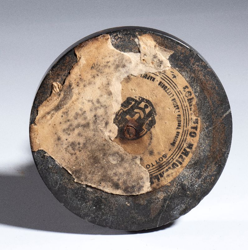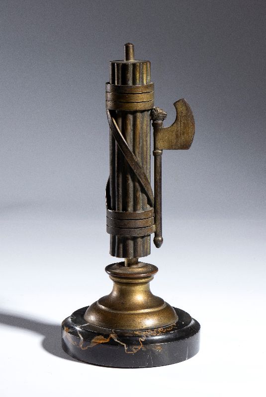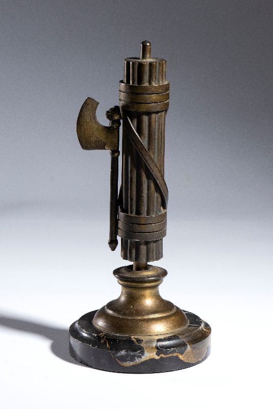 Fascio littorio in bronzo a tutto tondo, montato su base di marmo, con rimanenza di cartiglio applicato sul fondello che in completezza riporterebbe "COMITATO NAZIONALE PRO CIMITERO MONUMENTALE DEL GRAPPA - SOTTO L'ALTO PATRONATO DI S.M. IL RE - Sezione Vendita Fascio Littorio - Napoli Via Torino 48"