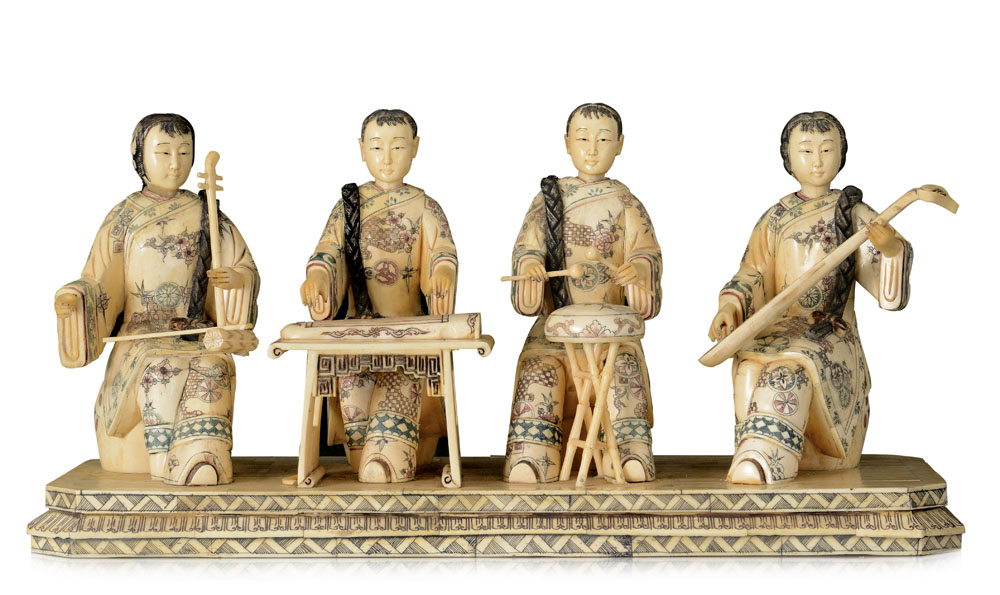 AVORIO GRUPPO CON QUATTRO FIGURE DI SUONATRICI IN OSSO, CINA, XX SECOLO;...