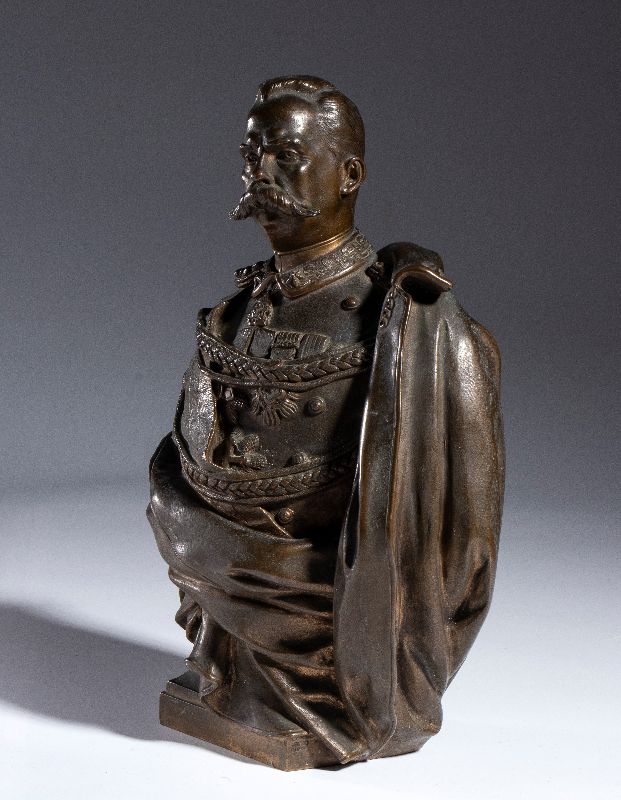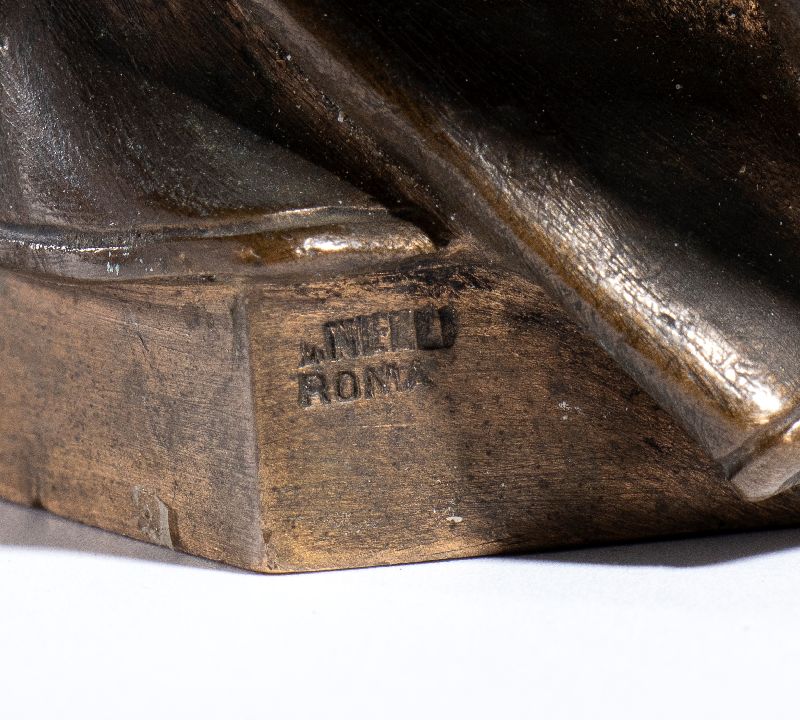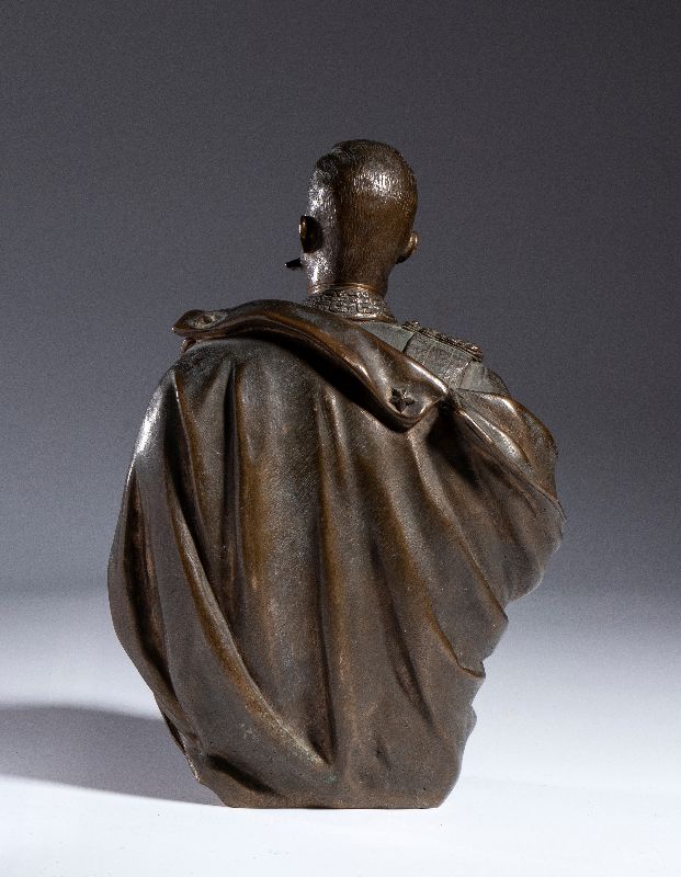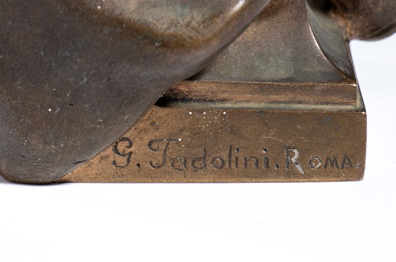 Busto in bronzo, ritratto del Re UMBERTO I di Savoia (Umberto Rainerio Carlo Vittorio Emanuele Giovanni Maria Ferdinando Eugenio di Savoia; Torino, 14 marzo 1844 – Monza, 29 luglio 1900). Importante scultura in bronzo di fine '800 realizzata e firmata da Giulio Tadolini (Roma, 22 ot8tobre 1849 – Roma, 18 aprile 1918). Prodotta dalla fonderia NELLI (attiva nel settore della medaglistica di fine 800 ed inizio 900). Misura circa cm.23 di altezza, in perfette condizioni