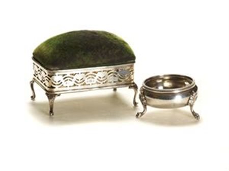 LOTTO DI ARGENTI Lotto di argenti inglesi composto da: Scatola porta spilli in velluto e argento. Birmingham 1907 Peso netto dell'argento gr. 60 e da una saliera in argento - Londra 1872 argentiere :Edward C.Brown Peso gr. 74 Lot of English silver consisting of: Storage Box with velvet and silver pins. Birmingham 1907 Net weight of silver gr. 60 and a silver salt cellar - London 1872 silversmith Edward C. Brown Weight gr. 74