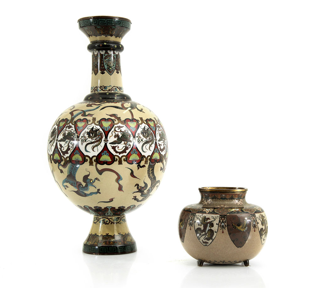 DUE VASI IN METALLO DECORATO A SMALTI CLOISONNE', CINA O GIAPPONE, INIZIO XX SECOLO, uno a balaustro e uno globulare schiacciato, decori ad animali fantastici entro riserve e volute.