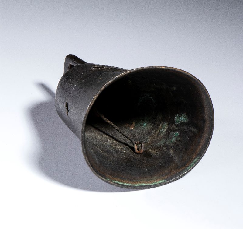 Campanella in bronzo da scaccino di chiesa per radunare i fedeli, in chiesa o nella cappella dell'ospedale (probabile opera del Cavalierato di Malta), Italia del sud. Completa del suo batacchio in metallo.