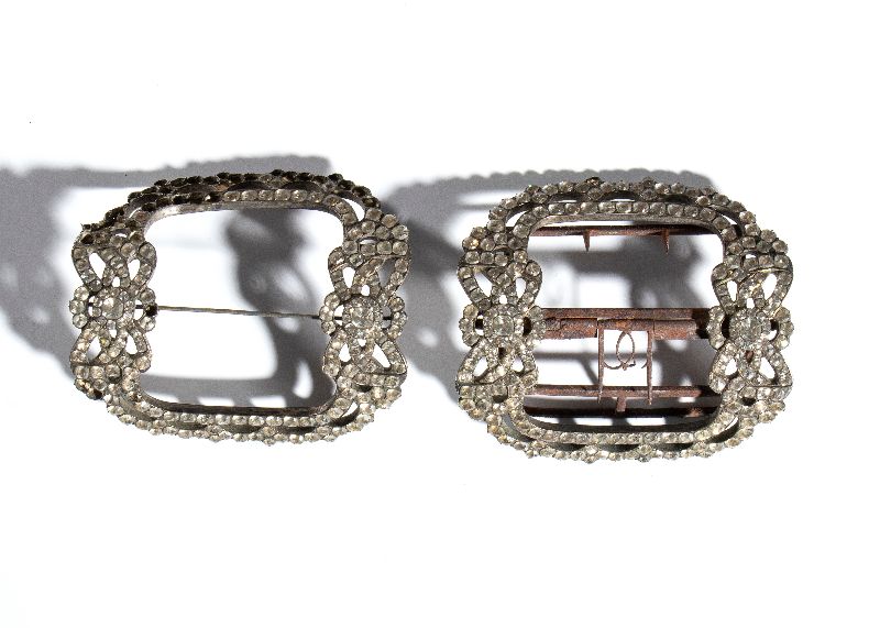 Coppia di fibbie in metallo, impreziosite da strass. Presumibilmente per calzature per via della loro forma, fibbie della seconda metà del '700. Misure circa cm.11x10.