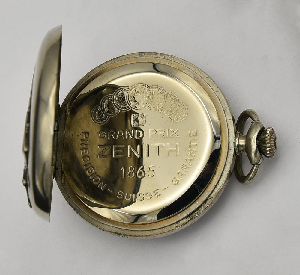 CASSA: in metallo con doppio fondello, decorata sul retro con la rappresentazione di un treno realizzata a sbalzo; numero di cassa presente sulla superficie interna del fondello piu' esterno: sulla superficie esterna del fondello piu' interno inciso "Grand Prix/Zenith/1865", "Precision-Suisse-Garanti"