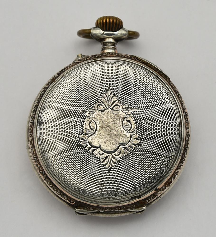 CASSA: in argento lavorata sul retro a sbalzo e incisione; fondello interno in rame; numero di cassa visibile sulla superficie di antrambi i fondelli; titolo e punzone dell'argento (gallo) presenti sulla superficie interna del fondello piu' esterno; sulla superficie esterna del fondello piu' interno inciso: "Remontoir/Cylindre 10 Rubis"