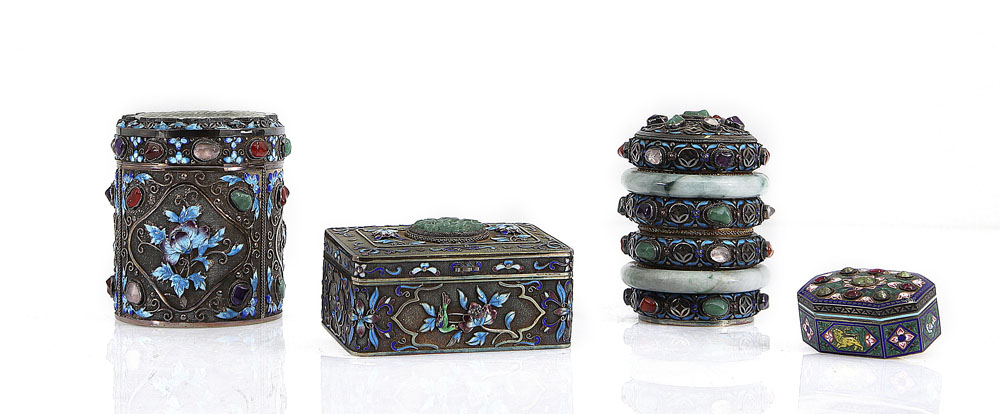 QUATTRO SCATOLE IN ARGENTO DECORATE A SMALTI CON APPLICAZIONI DI PIETRE DURE, ARTE ORIENTALE, INIZIO XX SECOLO, di diversa forma e decoro con motivi floreali entro riserve; ammaccatura e mancanza.