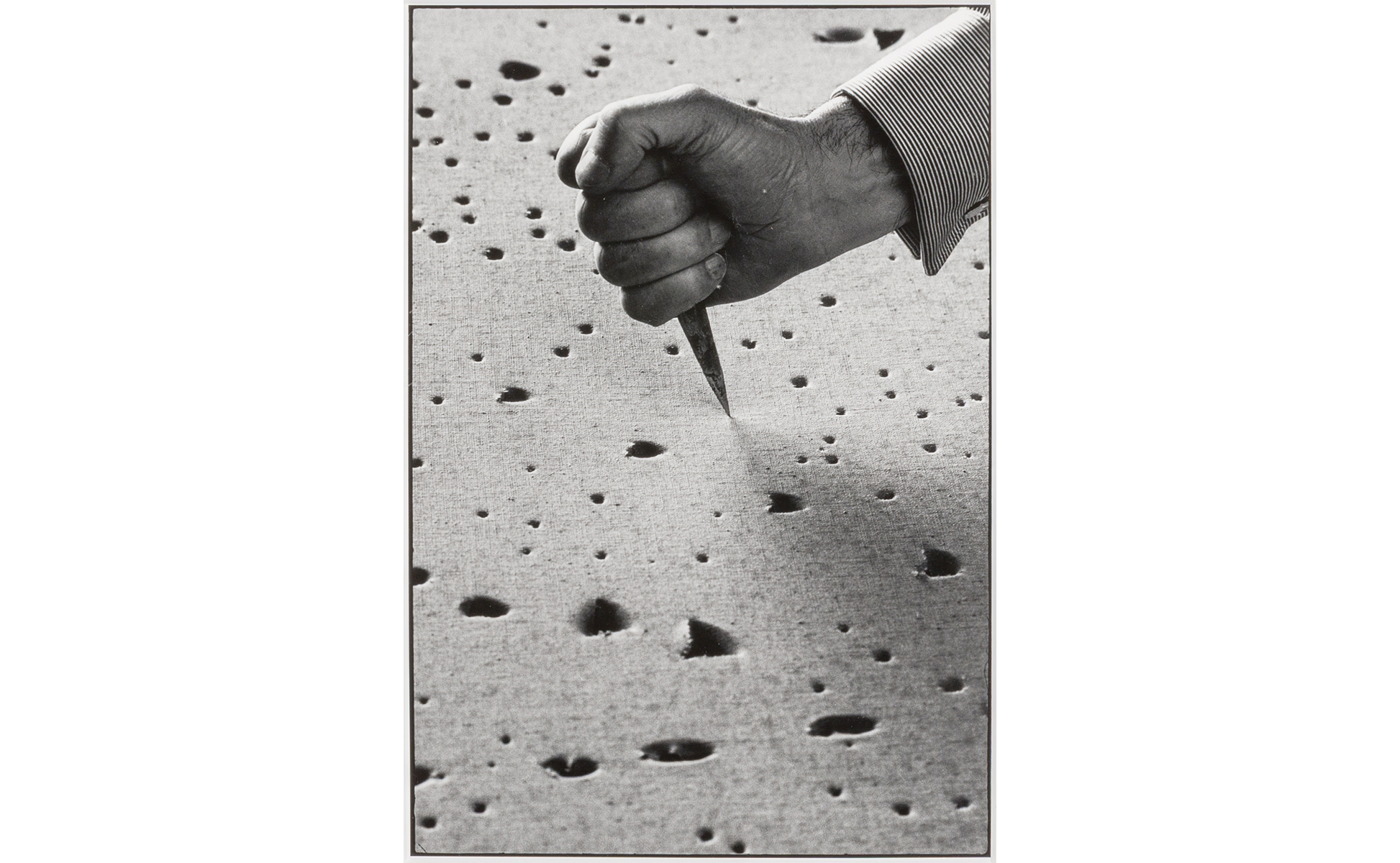 Lucio Fontana particolare della mano il punteruolo sulla tela 1966