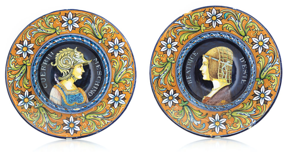 COPPIA DI PIATTI IN CERAMICA, MOLARONI, PESARO, XX SECOLO, decoro policromo, nel cavetto con profilo di "Beatrice d'Este" e "Guerrin Meschino", tesa a volute fiorite; sbeccature e uno con rincolli al bordo.