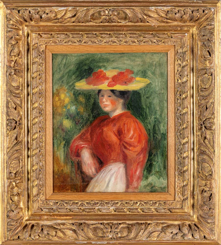 Jeune femme au corsage rouge et au chapeau jaune firmato in basso a destra Renoir