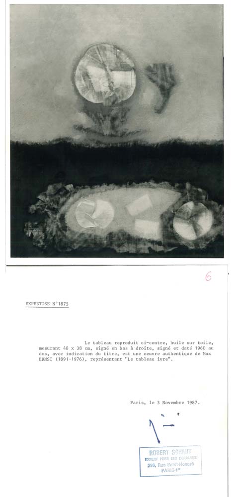 W. Spies, S. e G. Metken, Max Ernst / Werke 1954-1963, Houston, Texas, 1998, p. 257, n. 3546 (erroneamente intitolato le bateau ivre), (ill.). Si allega dichiarazione di autenticità su fotografia di Robert Schmit n. 1875, in data Parigi, 3 Novembre 1987. Robert Schuhl, Parigi;