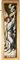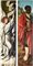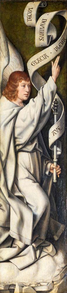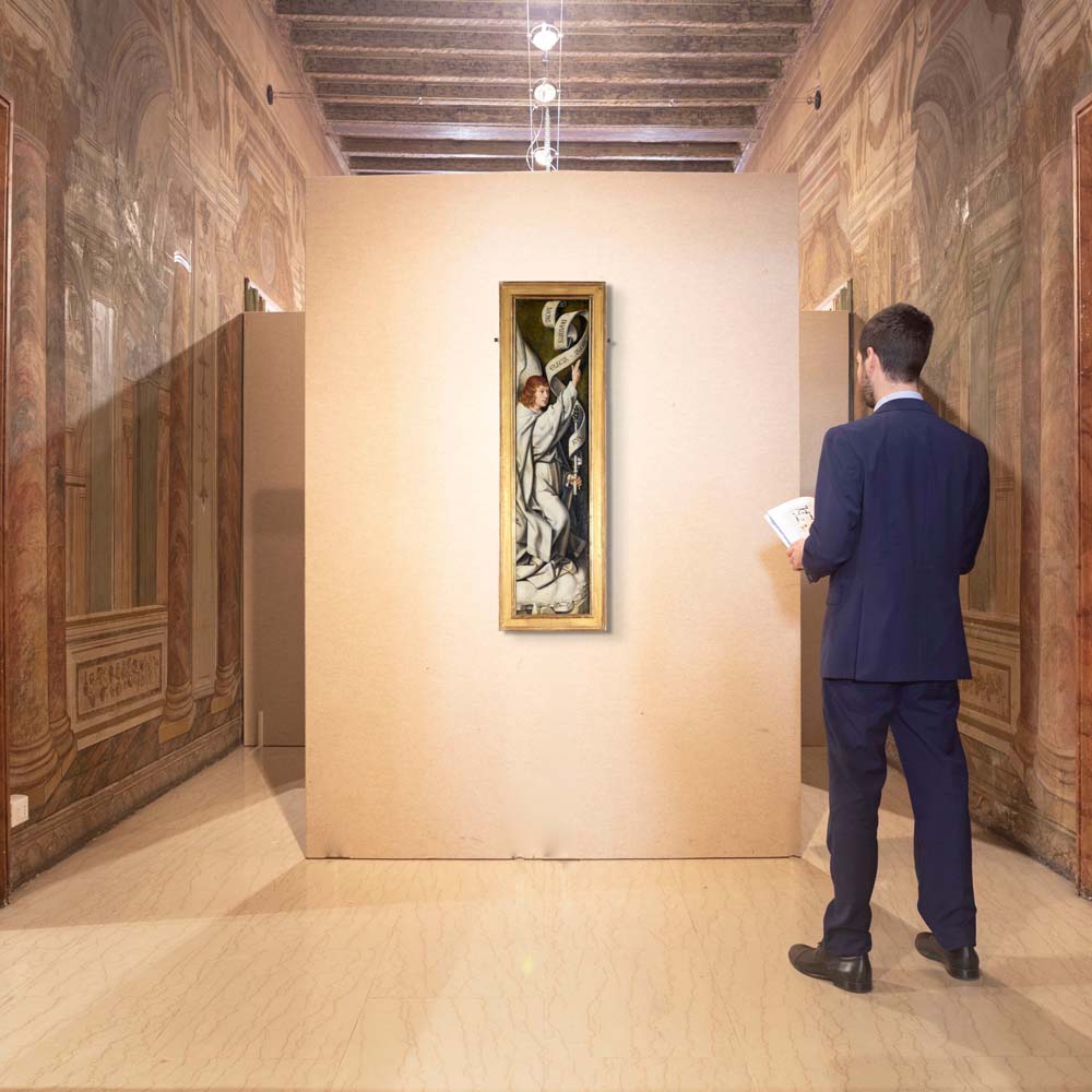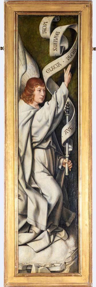 a) San Gabriele Arcangelo; b) Re magio. La tavola si collega per stile e iconografia allo sportello del trittico del Museo Civico di Pistoia, già attribuito a Luca d’Olanda e Hugo van der Goes, e poi ricondotto da Friedländer al Maestro di Francoforte. Le affinità nella resa dell’Annunciazione e nei caratteri fisionomici confermano la qualità e l’importanza del nostro esemplare. olio e tempera su entrambi i lati della tavola cm 114,5 x 27 - in cornice cm 126,8 x 39,5