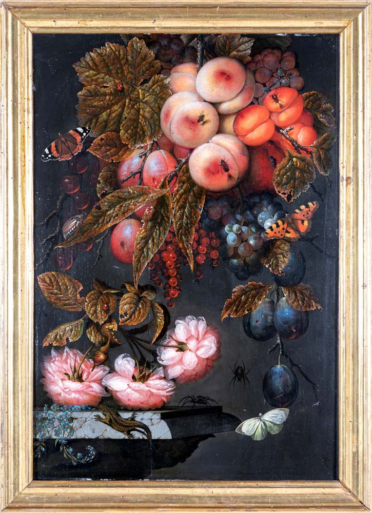 Natura morta con fiori, frutta e insetti Firmato e datato in basso a destra Ottmar Elliger Anno ... olio su tavola cm 52 x 35,7 - in cornice cm 58,8 x 42,5