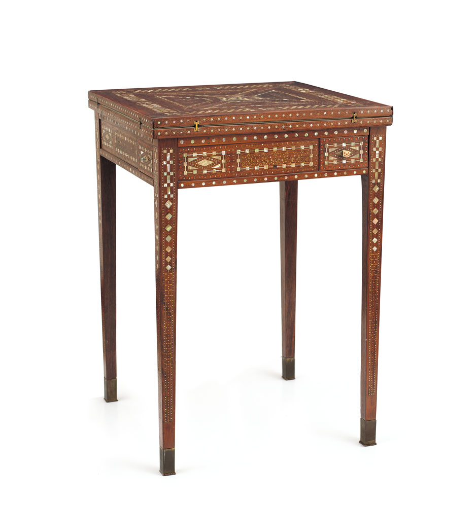 MOBILE DEL XX SECOLO TAVOLINO DA GIOCO INTARSIATO IN MADREPERLA E LEGNI VARI,...