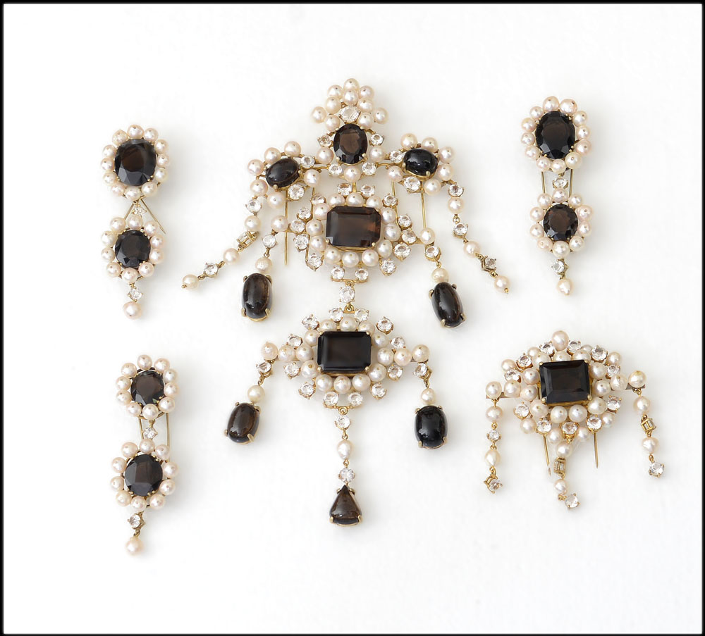 PARURE DI SCENA, ANNI '50, composto da cinque spille di diversa forma in metallo dorato, gemme sintetiche e perle.