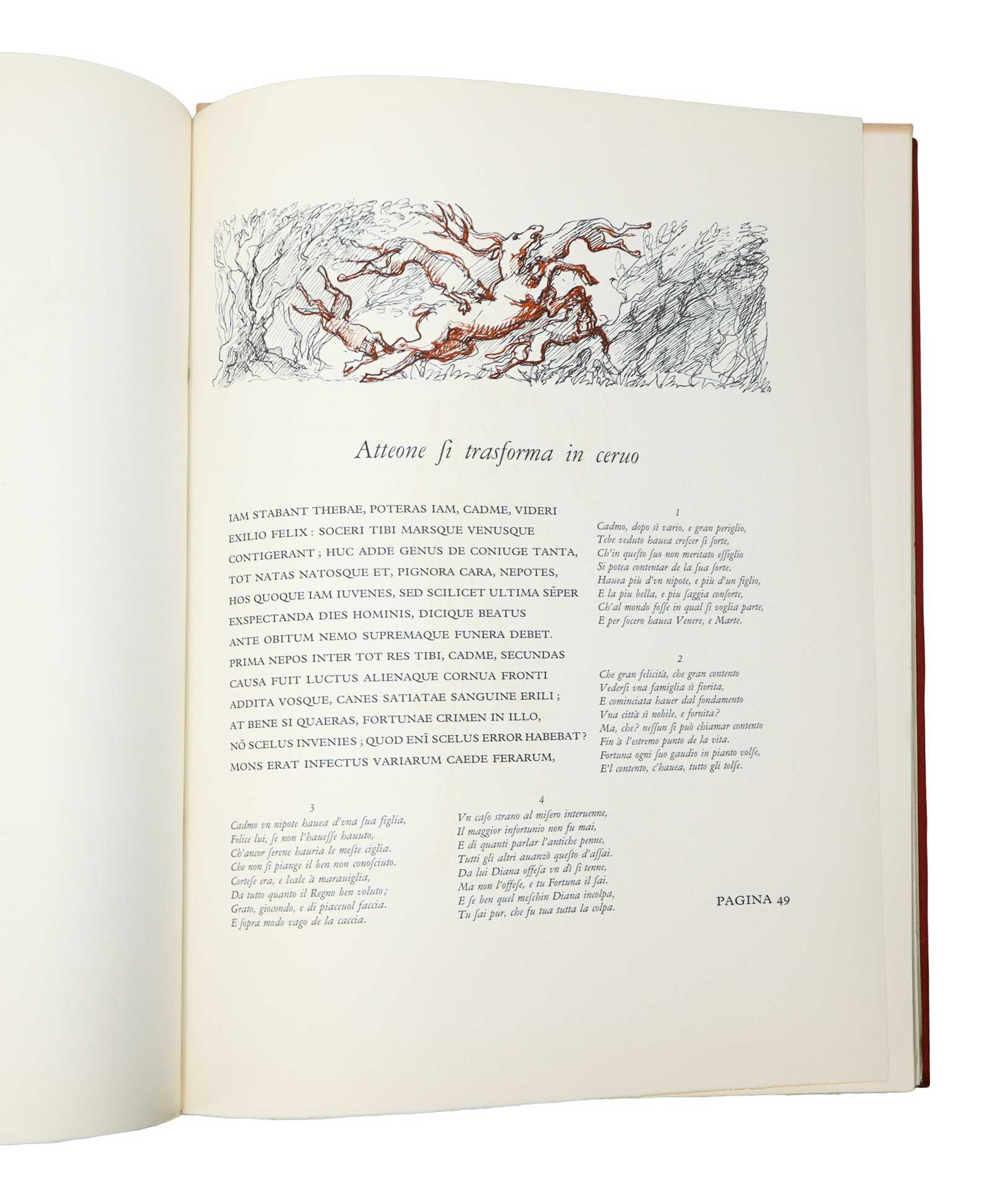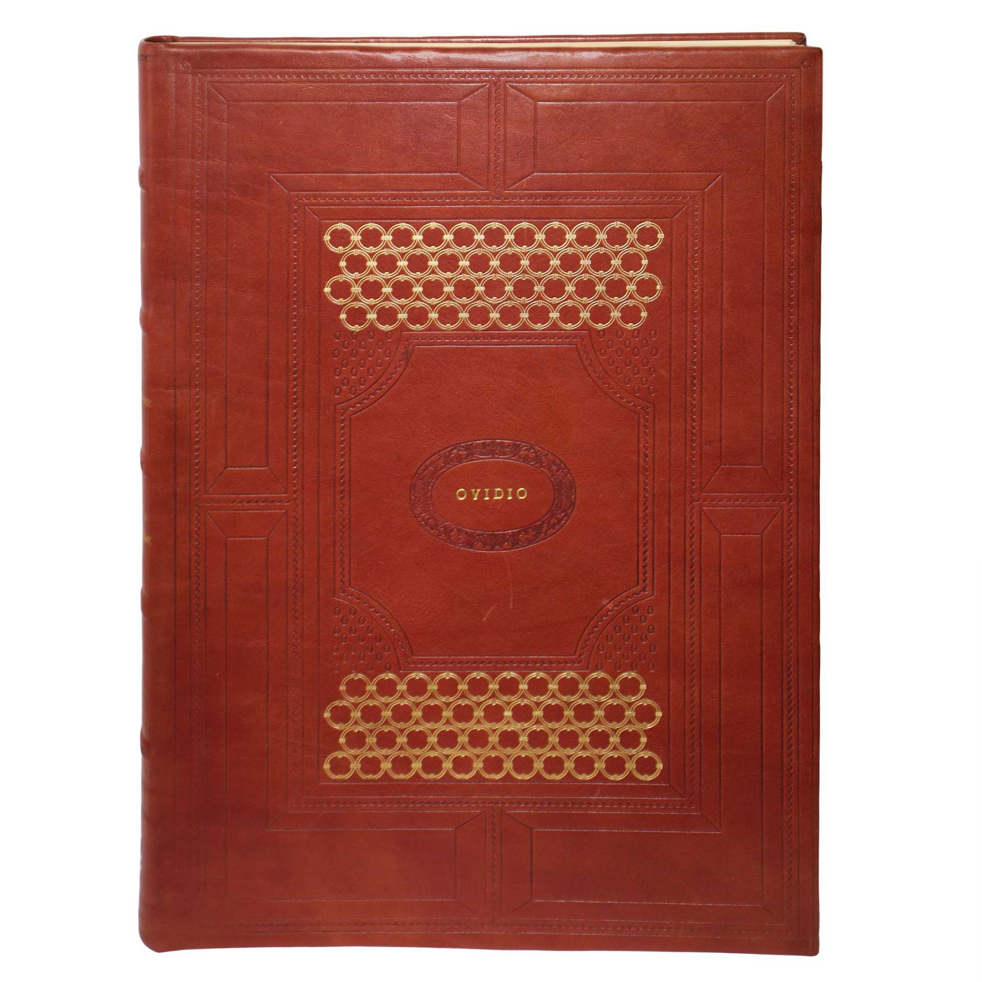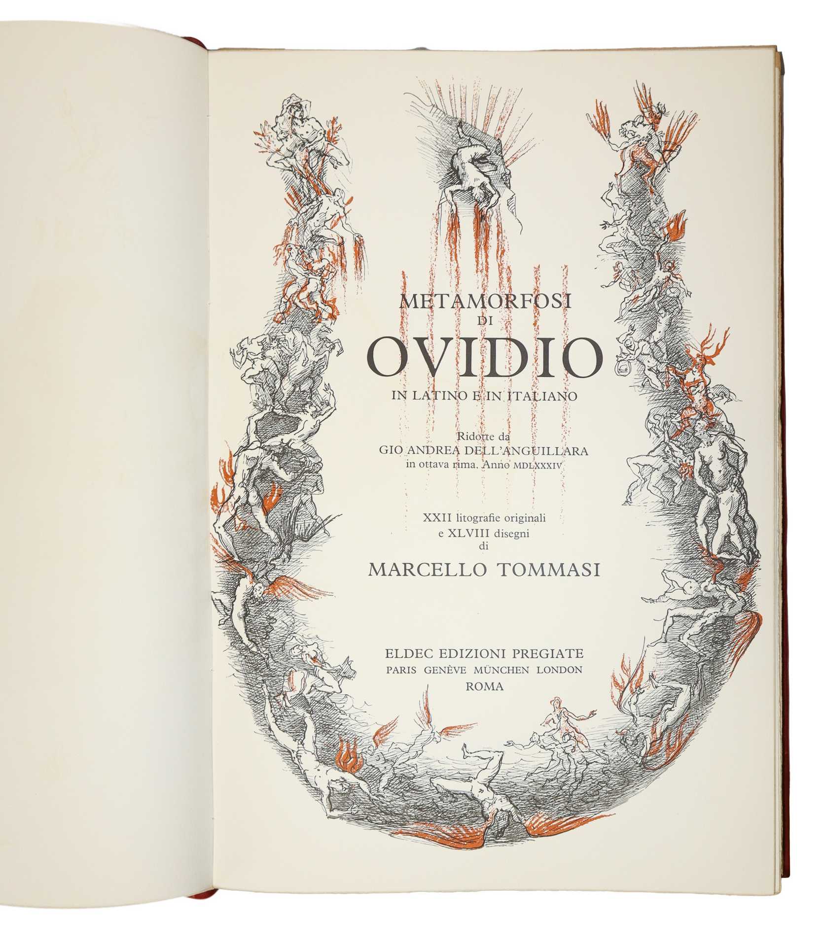 Marcello Tommasi (Pietrasanta 1928 - Lido di Camaiore 2008) - N°2 Volumi: Le Metamorfosi di Ovidio, con 48 disegni nel testo e 22 litografie fuoritesto dell'artista Marcello Tommasi. Inni in latino in italiano ridotte da Giò Andrea dell'Anguillara, con rilegature artigianali in vitello rosso ed impressioni in oro zecchino, 48 disegni nel testo e 22 litografie fuoritesto dell'artista Marcello Tommasi.