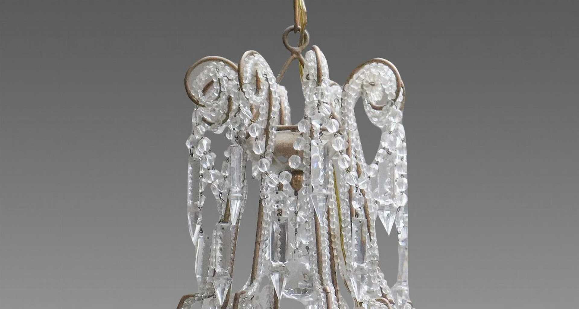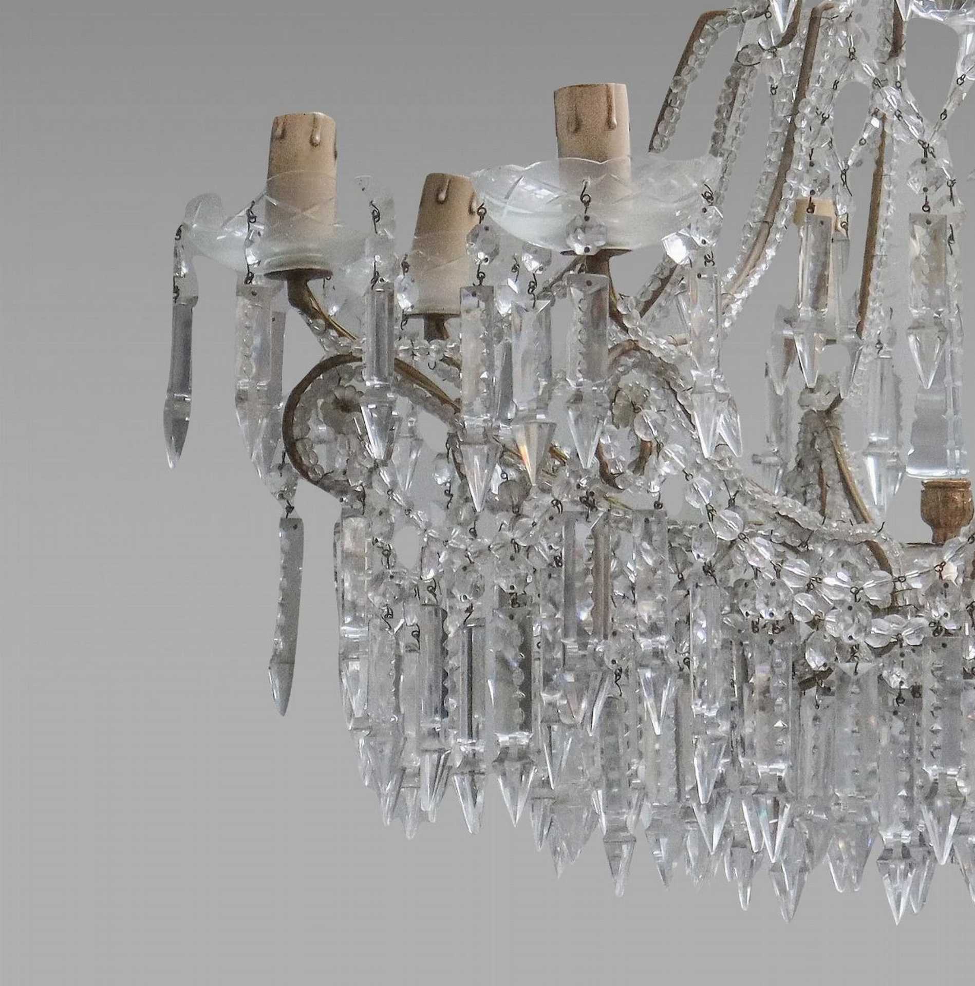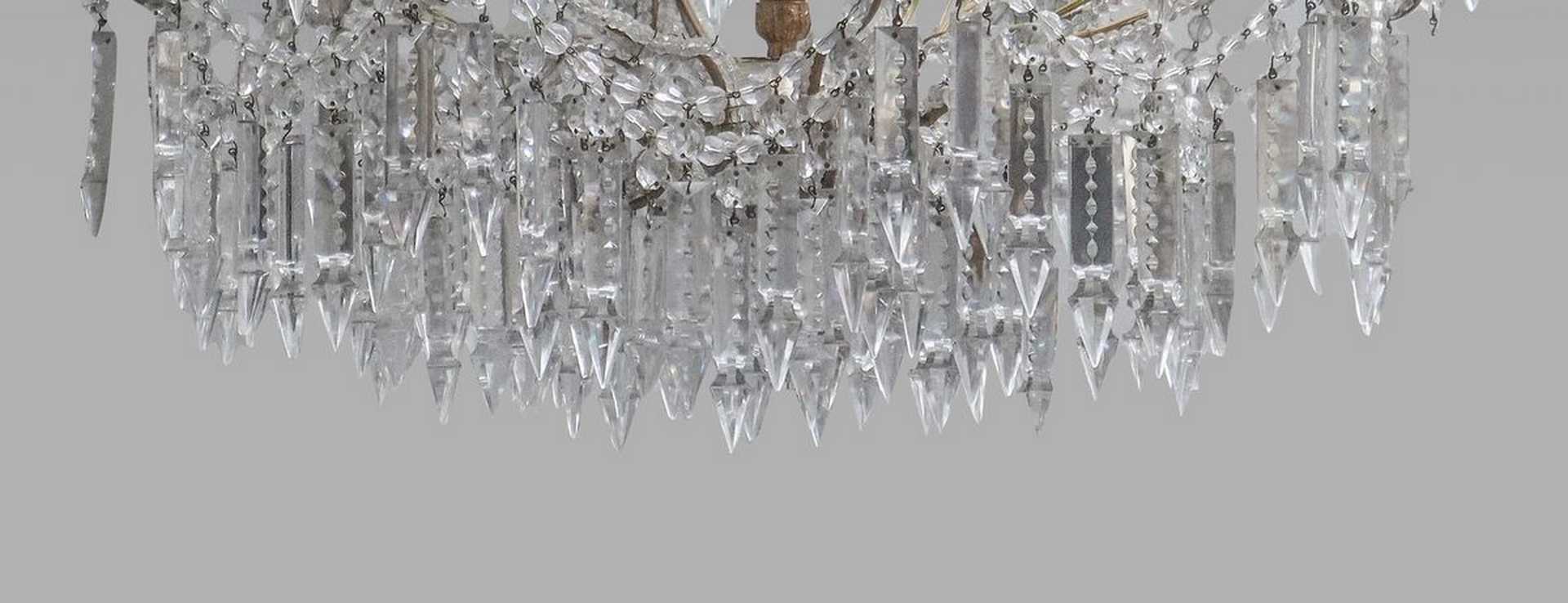 Lampadario a cesto in vetro, Early 20th Century h cm 75, diametro cm 70 Con brindoli e sfere sfaccettate a 8 luci