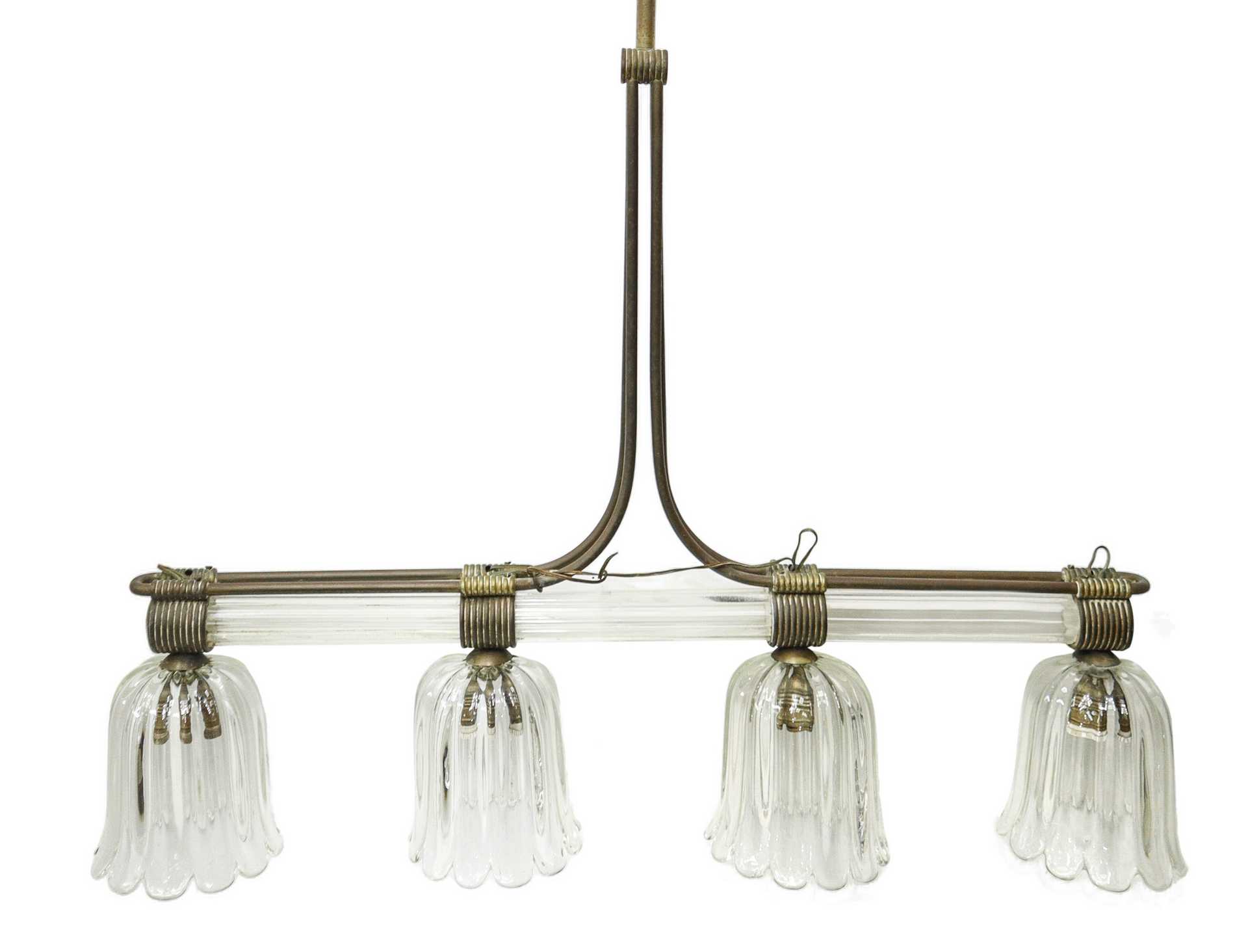 Lampadario deco' a 4 campane in vetro pesante, 1920 H cm 138x90