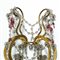 Applique in metallo dorato con brindoli in vetro a sfere e fiori bianchi e ametista a tre luci