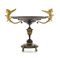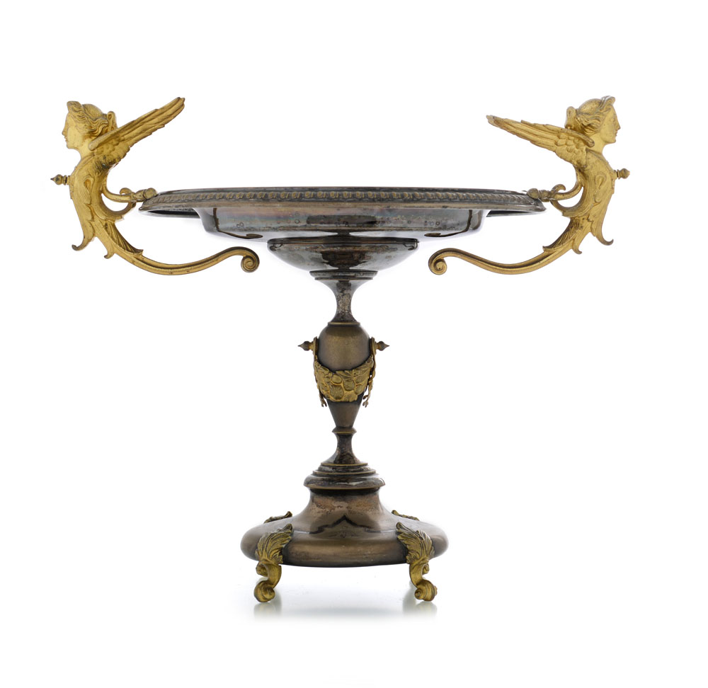 ALZATA IN METALLO ARGENTATO E DORATO, FINE XIX SECOLO, piatto centrato da medaglione con busto femminile, doppia ansa a busto di erma alata e base con piedini; usure.
