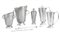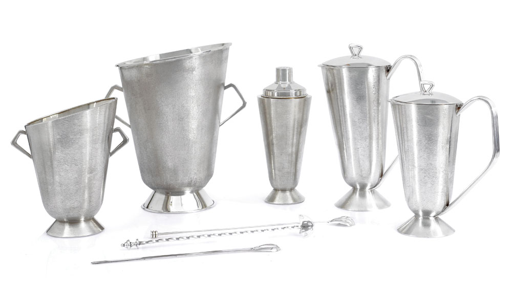 SET DA BAR IN ARGENTO, MILANO, ANNI '60, composto da due secchielli, uno shaker e due versatoi con coperchio uniti a tre miscelatori.
