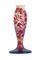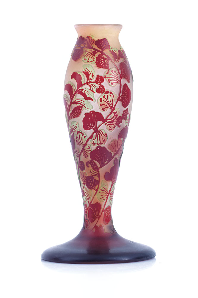 VASO IN VETRO DOPPIO, GALLE', 1900 CA., ovoidale con decoro a rami con fiori e foglie nei toni del rosso su fondo rosato, firma in rilievo a cammeo "Gallé".
